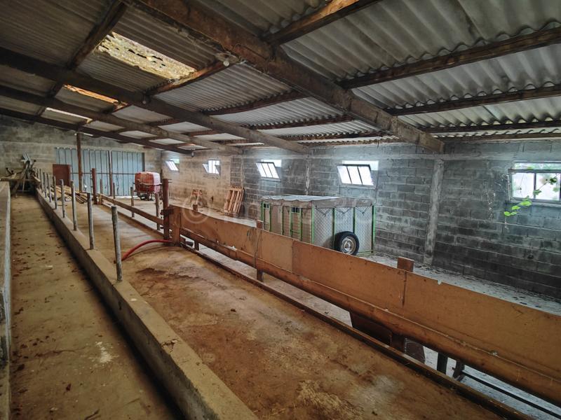 Opposite, several additional outbuildings include an open barn, a second enclosed barn, a large chicken coop, and a former goat shed of 100 m². There is also a garage and an adjoining workshop, each of 30 m², and a former stable of 59 m².