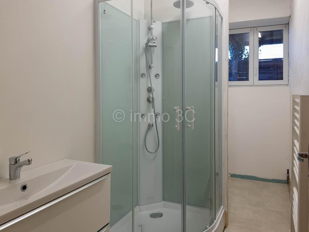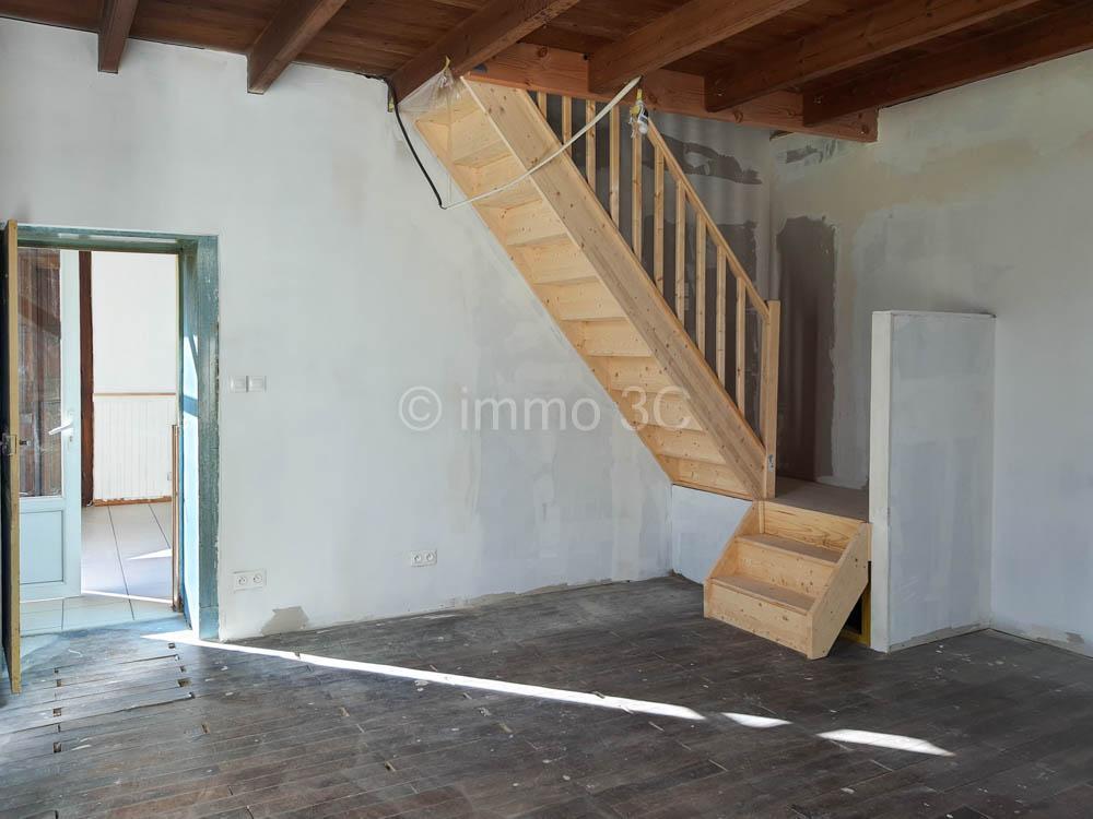 On the ground floor, it features a fitted kitchen of 23 m² enhanced by a wood-burning stove, a spacious 41.5 m² living room with a fireplace insert and a large front bay window, as well as a 23 m² room with original beams and parquet flooring, connected to the first floor by a staircase. A hallway provides access to a WC and a shower room.